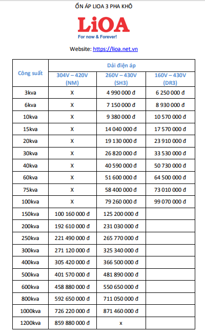 Bảng giá bao gồm các model Lioa 3 pha sản xuất theo quy chuẩn. Các loại ổn áp có quy cách khác được sản xuất theo yêu cầu.