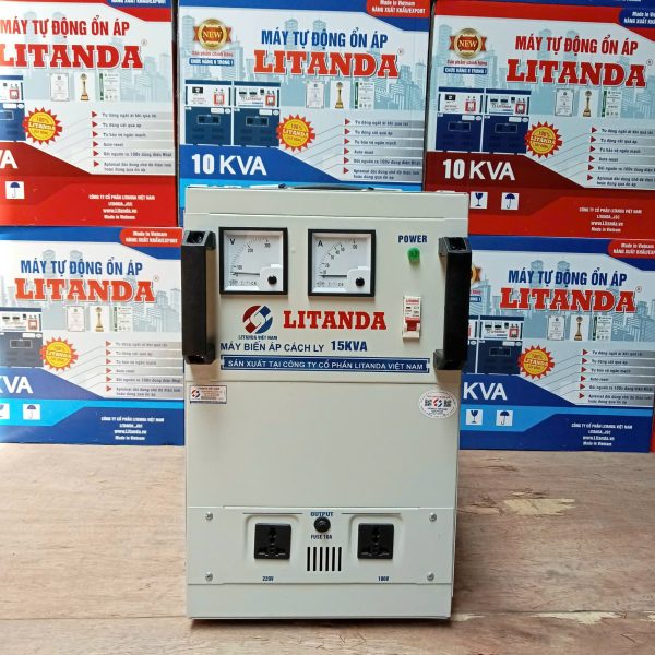 Máy biến áp cách ly Litanda 15KVA 1 Pha 15KW chống giật, chống nhiễu 100% dây đồng. Sản phẩm được tích hợp đủ các đầu điện áp ra 220v/ 200v/ 120v/ 110v/ 100v. Máy phù hợp sử dụng cho hộ gia đình có các thiết bị điện nhập khẩu Hoa Kỳ, Nhật Bản,…