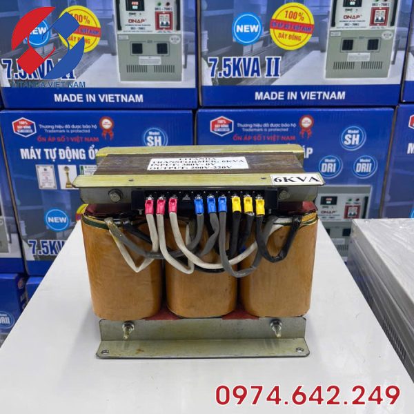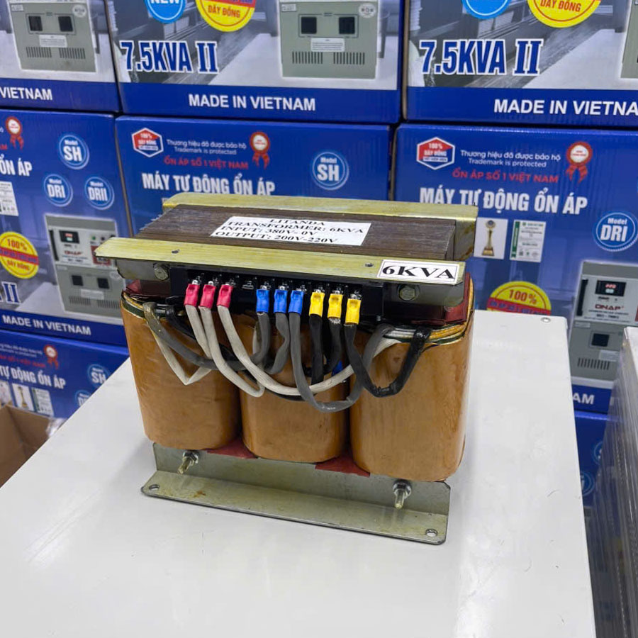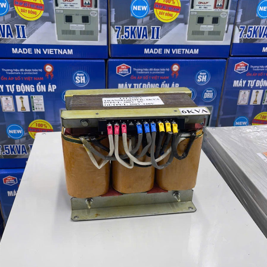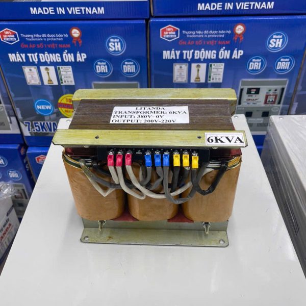 Với công suất 6KVA (6000VA), biến áp đáp ứng tốt nhu cầu sử dụng cho nhiều hệ thống máy móc, thiết bị công nghiệp, máy CNC, thiết bị điện tử và các dây chuyền sản xuất yêu cầu nguồn điện chuẩn xác.