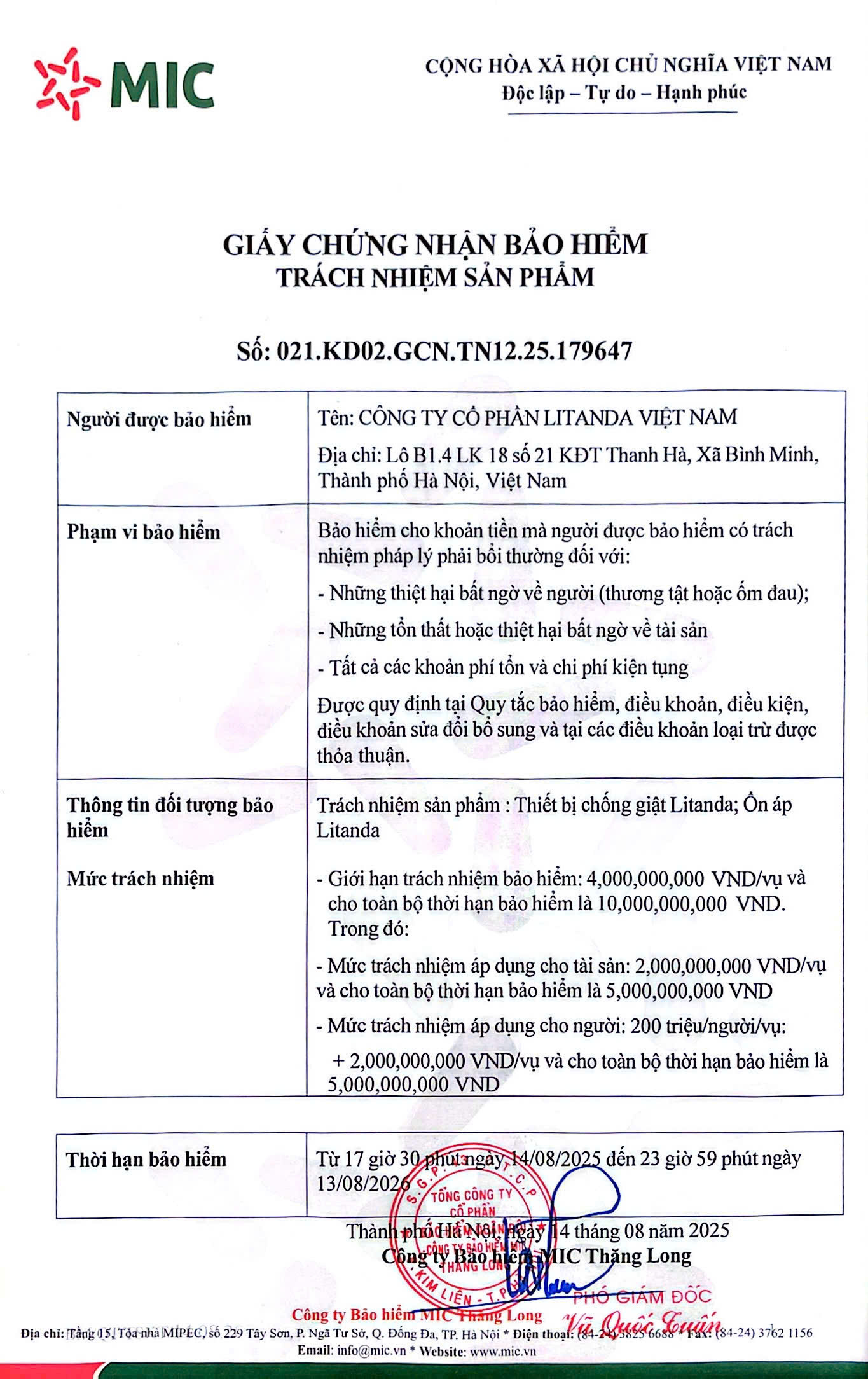 Chính sách bảo hiểm trách nhiệm sản phẩm với hạn mức bồi thường lên đến 10 tỷ đồng không chỉ thể hiện trách nhiệm xã hội mà còn là minh chứng rõ ràng cho tầm vóc và uy tín thương hiệu Litanda Việt Nam – một trong những đơn vị tiên phong trong lĩnh vực thiết bị điện và giải pháp an toàn điện toàn diện.