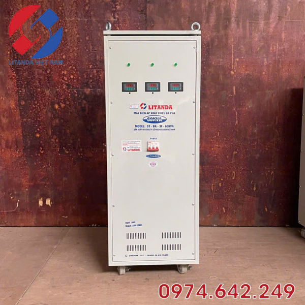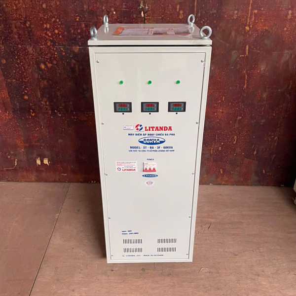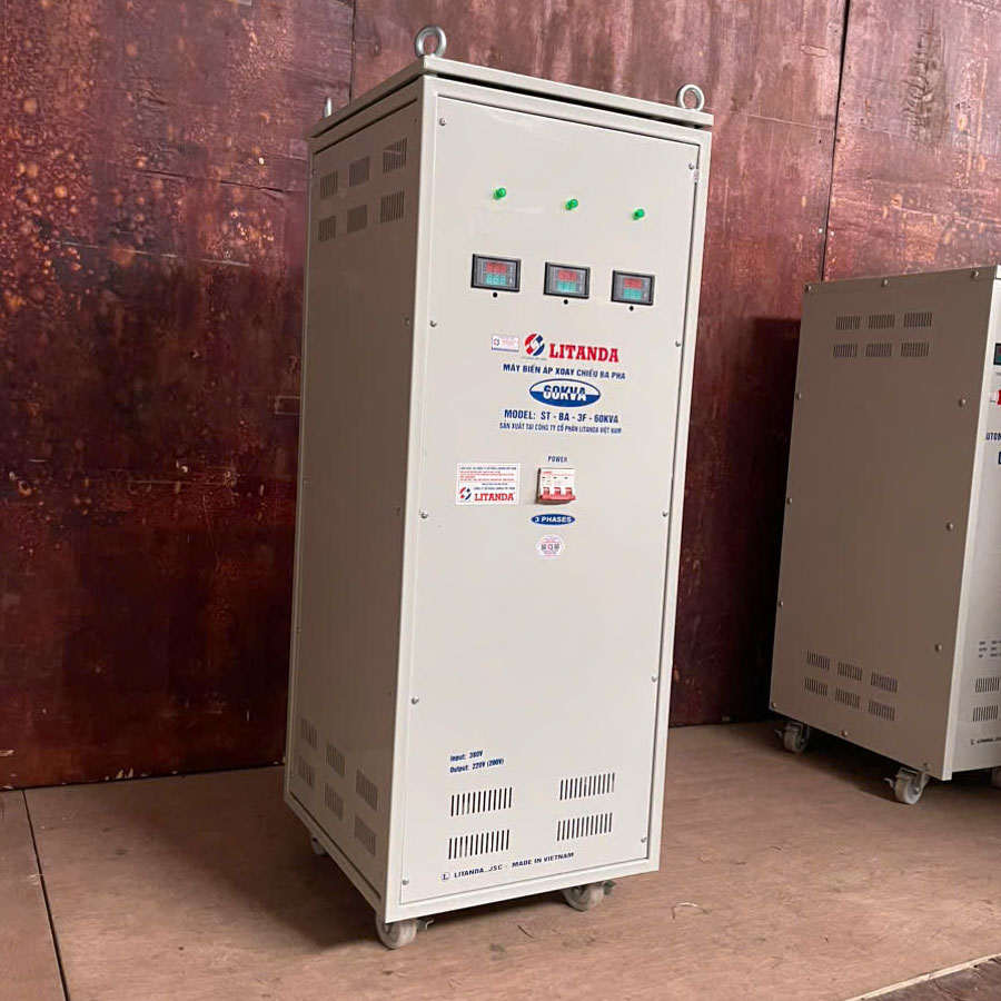 Cung cấp Biến áp 60kva 3 pha và ổn áp lioa 60kva toàn quốc giá luôn rẻ nhất thị trường. Biến áp tự ngẫu 60kva 3 pha Lioa được bảo hành 04 năm, lắp đặt vận chuyển miễn phí. Biến áp 60kva tự ngẫu Litanda nặng 165Kg, kiểu dáng công nghiệp, có bánh xe dễ dàng di chuyển.